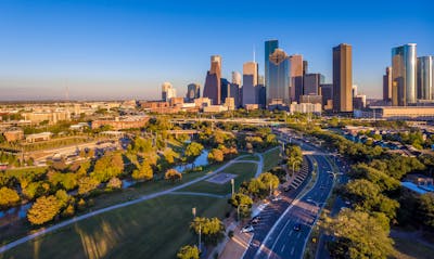 An aerial view of downtown El Paso, showing the traffic and densely populated city along the US-Mexican border.